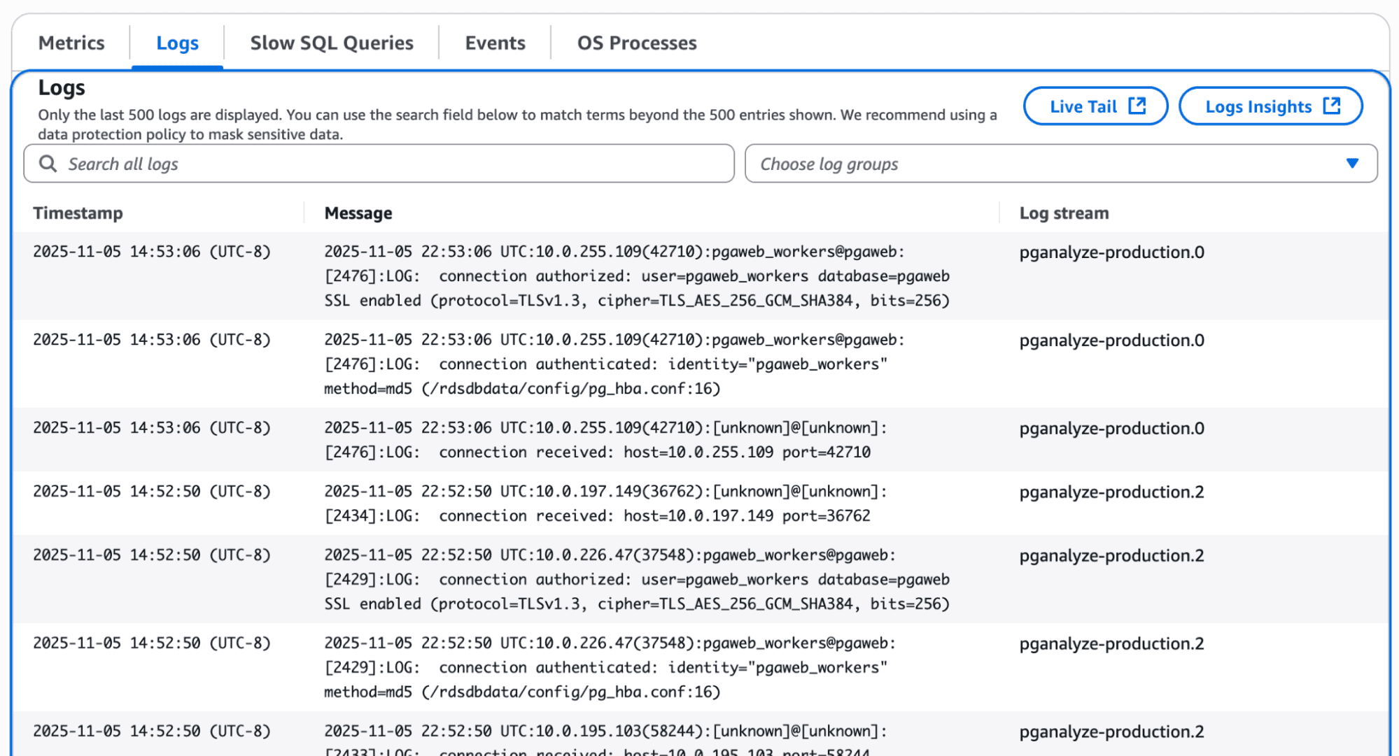 With CloudWatch Log exports enabled, Database Insights can also surface data previously available in the Logs view: