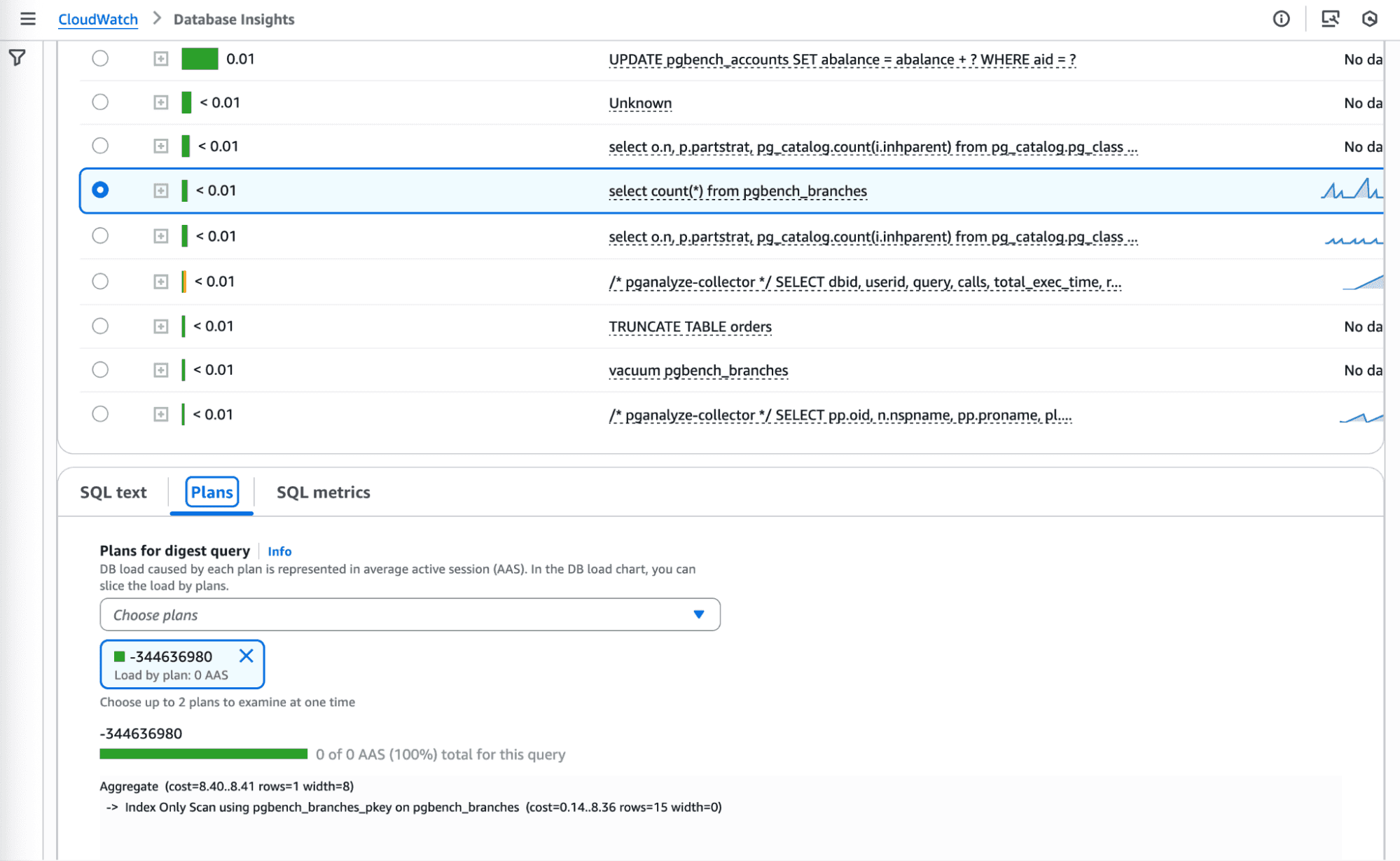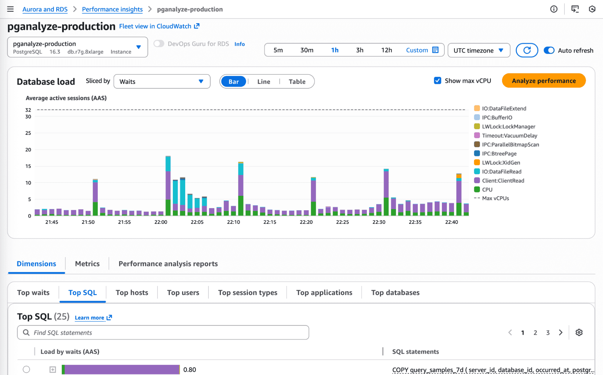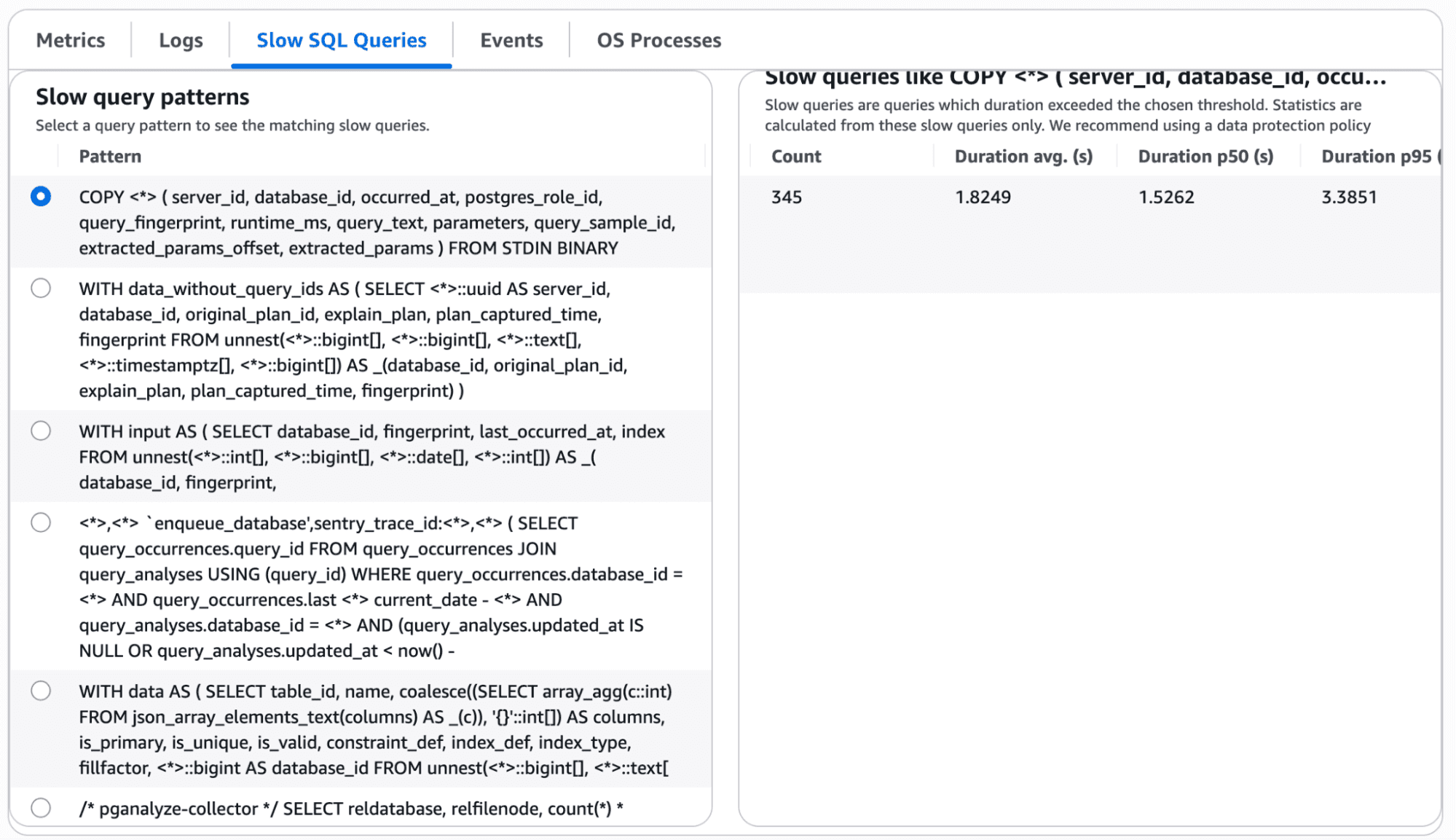 Existing limitations, such as limited query text being visible (up to the track_activity_query_size), or only showing the Top 25 queries in a given timeframe, appeared to persist in Database Insights in our testing.