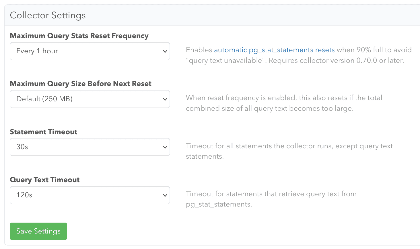 Every 10 minutes, the collector loads the query text from pg_stat_statements into memory in order to normalize and fingerprint it. This is a very expensive step and can result in the collector crashing from running out of memory. To address that, when resets are enabled with the "Maximum Query Stats Reset Frequency" setting, the collector will also perform a reset if the aggregate size of the query text returned from pg_stat_statements grows beyond 250 MB. You can optionally increase that limit using the "Maximum Query Size Before Next Reset" setting, which can be advisable when you have very large query texts.