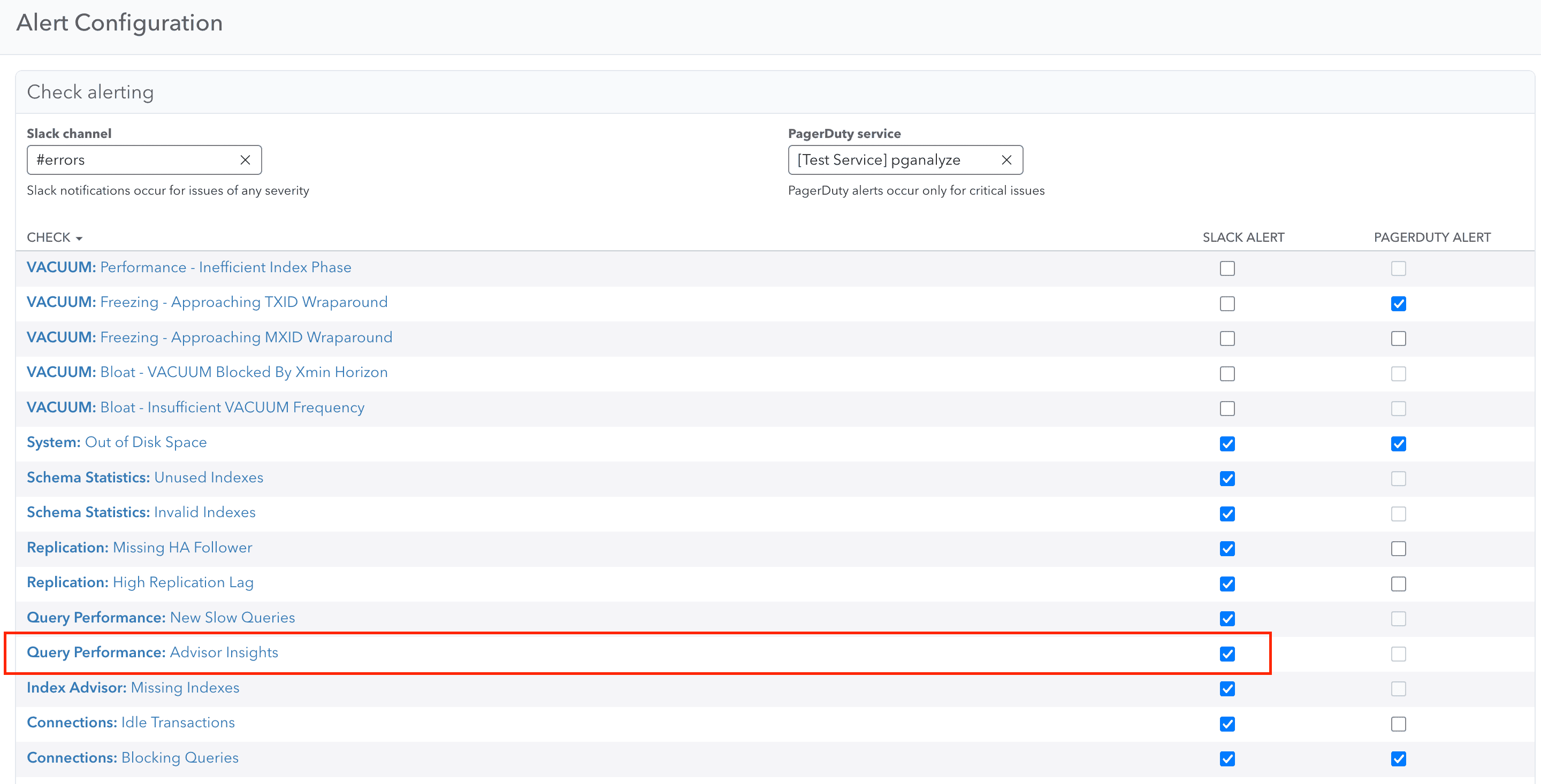 Query Advisor checks are enabled by default for all databases in your pganalyze organization on Scale and Enterprise plans, but alerts must be explicitly configured to receive notifications about newly detected optimization opportunities for new customers.