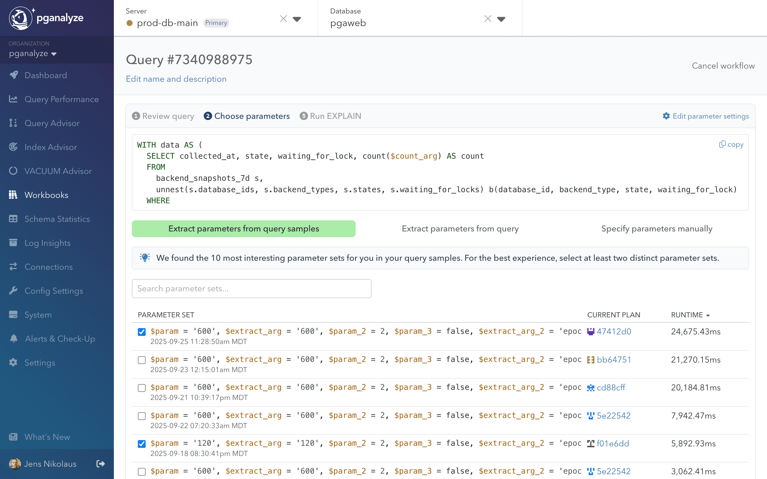 With your parameter sets defined, you can now run EXPLAIN ANALYZE using our collector, or running it manually on your own and pasting the output.
